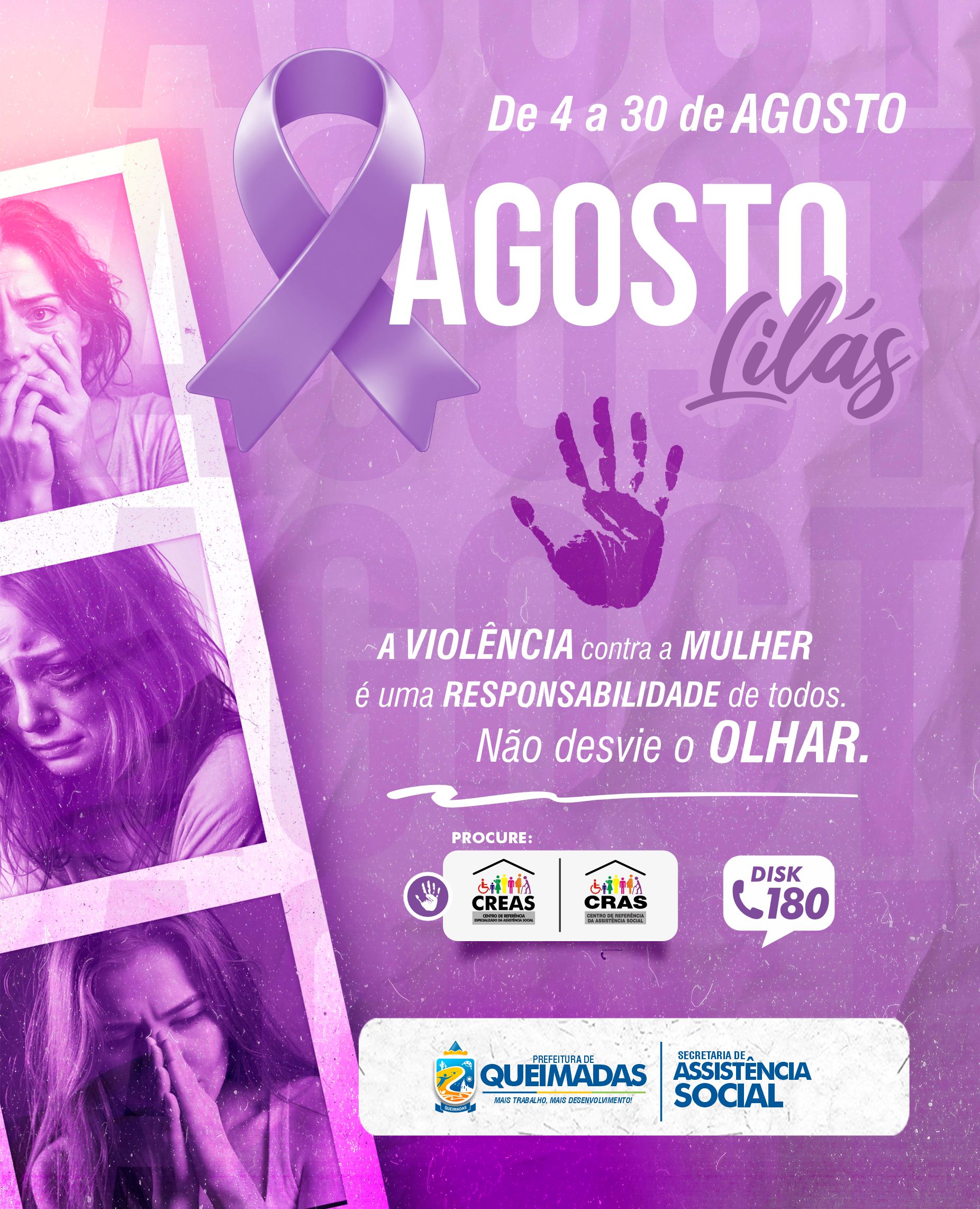 A campanha é uma iniciativa da Prefeitura de Queimadas, por meio da Secretaria de Assistência Social, CRAS e CREAS, e tem como objetivo mobilizar a população e fortalecer a rede de proteção às mulheres em situação de vulnerabilidade.